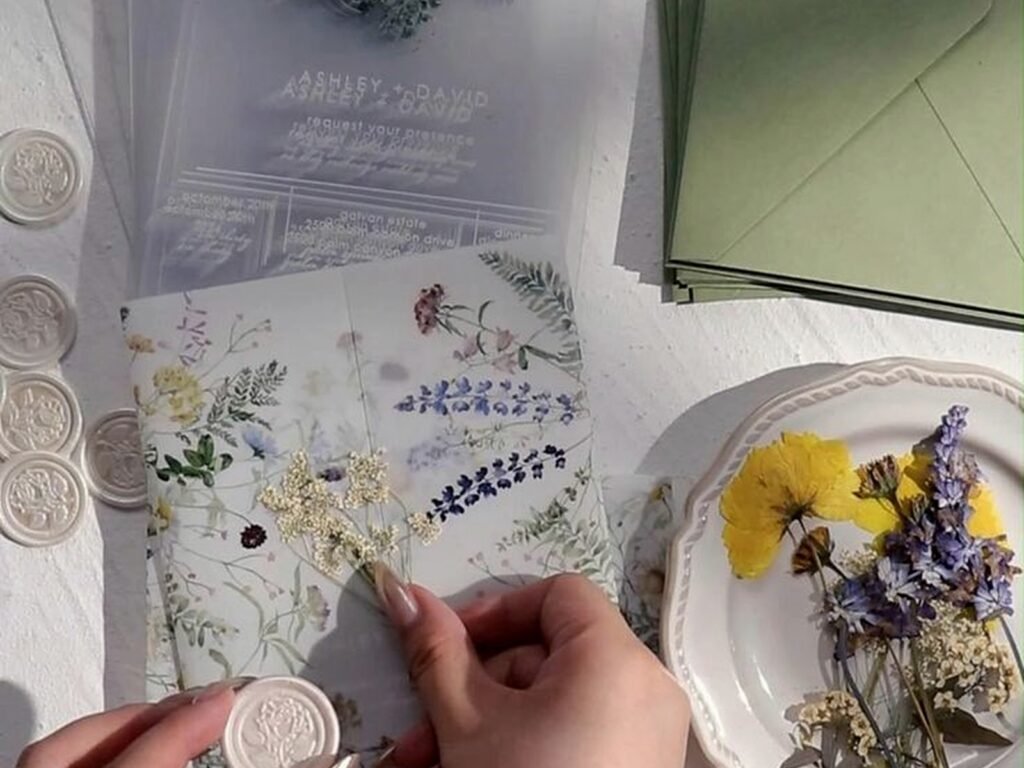 You’re gonna need cardstock as your base – I always recommend 80lb or higher because anything thinner feels cheap when people hold it. Get white or ivory unless you’re doing something specific with your color scheme. Then you need your decorative paper or vellum for layering, which is where the fun happens. Vellum is kinda magical because it adds that translucent elegant look without being too extra.