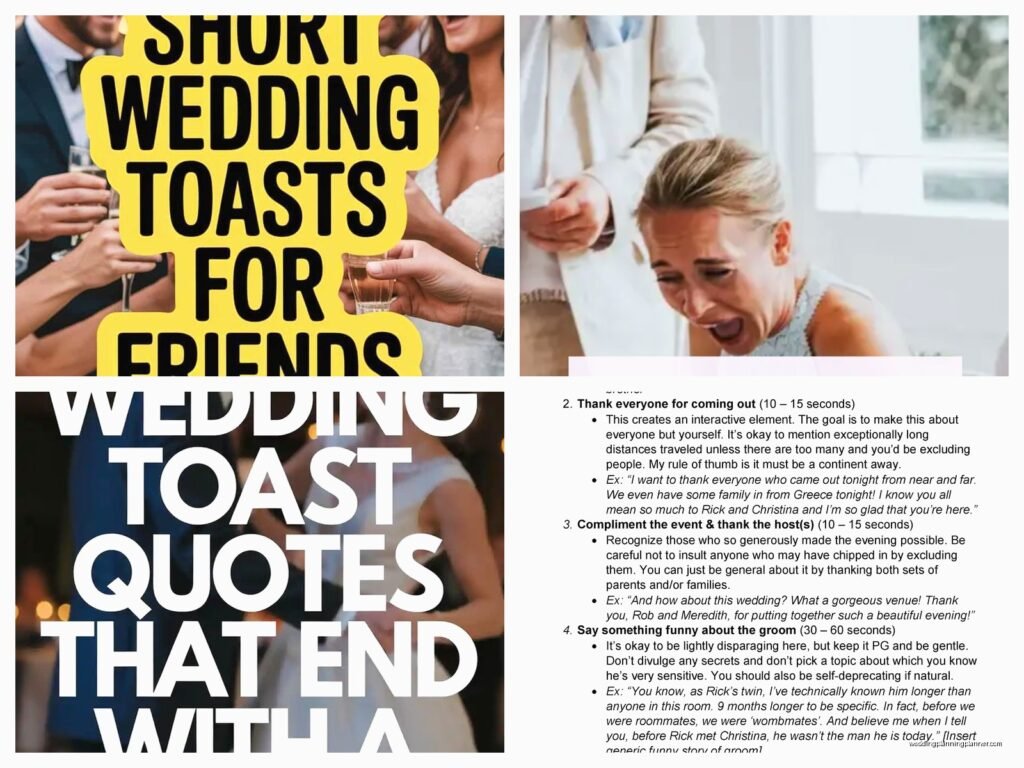 Okay so here’s what I tell people when they ask me about writing funny toasts. You want a structure that goes: brief intro about who you are, one or two funny stories, something sweet that connects to their relationship, and then the actual toast. That’s it. You don’t need to reinvent the wheel here.