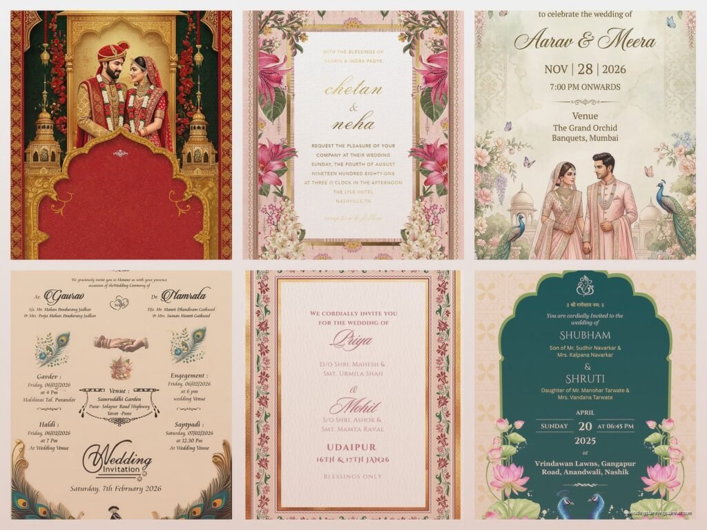 North Indian (Punjabi, Hindi-speaking regions): Brighter colors generally, more use of floral patterns, often includes Sikh religious symbols like the Khanda for Sikh weddings. Layout can be a bit more flexible and modern.