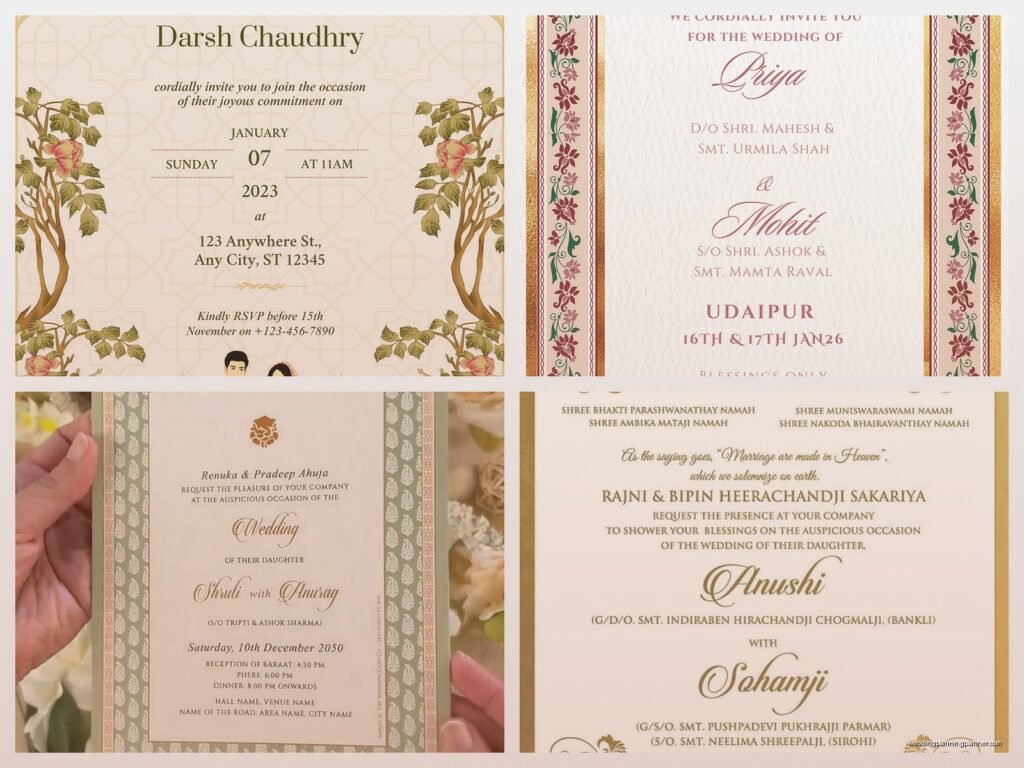 So design-wise, you’ve got traditional cards with elaborate borders, paisley patterns, lotus flowers, peacocks (SO many peacocks), and then you’ve got modern minimalist designs that are just… clean lines and gold foil. Both work. It depends on your wedding vibe.