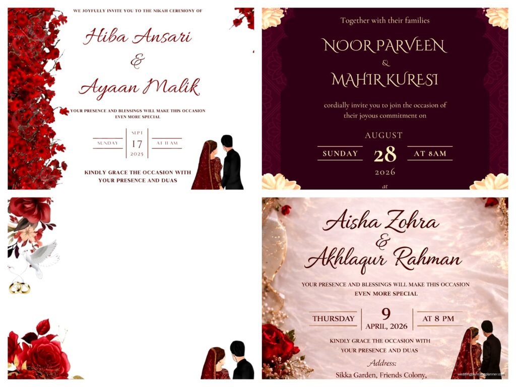 The main components you’re gonna need are the Bismillah (the “In the name of Allah” phrase), sometimes a Quranic verse about marriage, the couple’s names obviously, and here’s where it gets specific: you need to mention the Walima reception separately if there is one, because the nikah ceremony and the reception are distinct events. Some families do them on different days entirely.