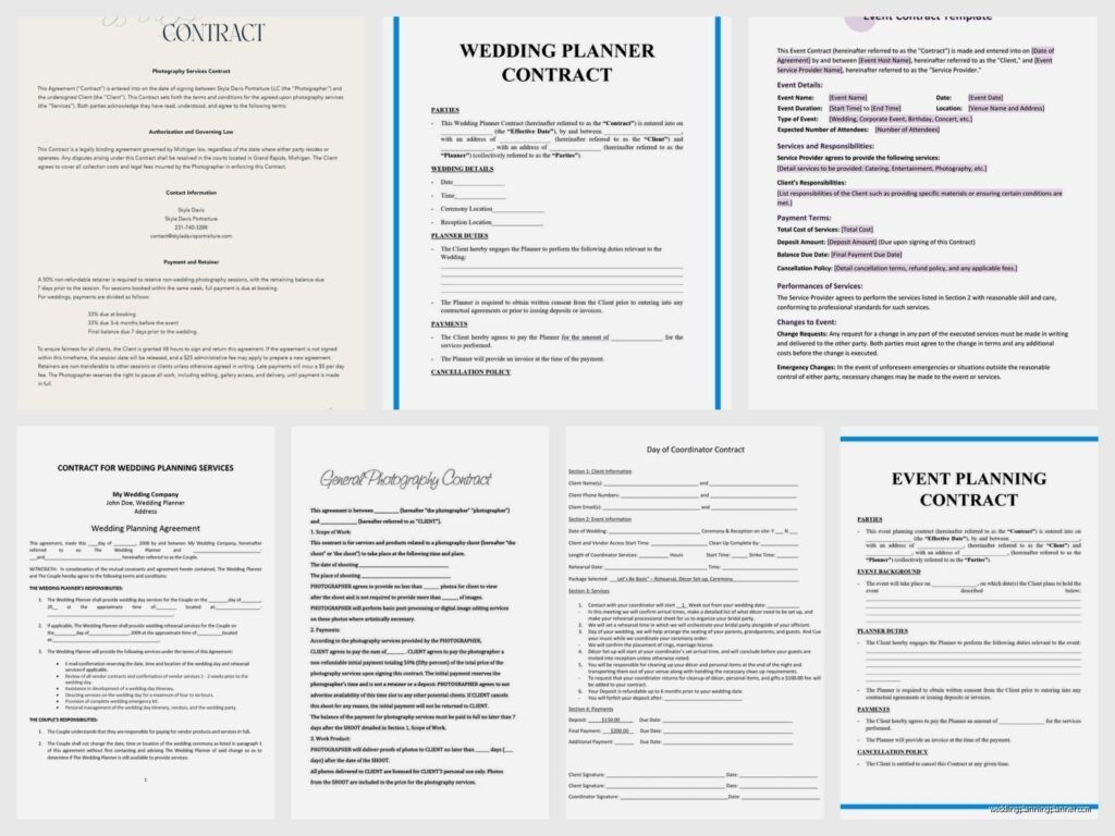 Wedding Planner contracts need all the stuff above plus specifics about planning meetings, vendor coordination responsibilities, and day-of timeline. Florist contracts should detail specific flowers (with substitution clause for seasonal availability), delivery time, setup requirements, and whether you’re picking up rentals afterward or they are. Photographer contracts need to address shot lists, editing timeline, number of deliverables, and what happens if you get sick—do you send a backup or refund?