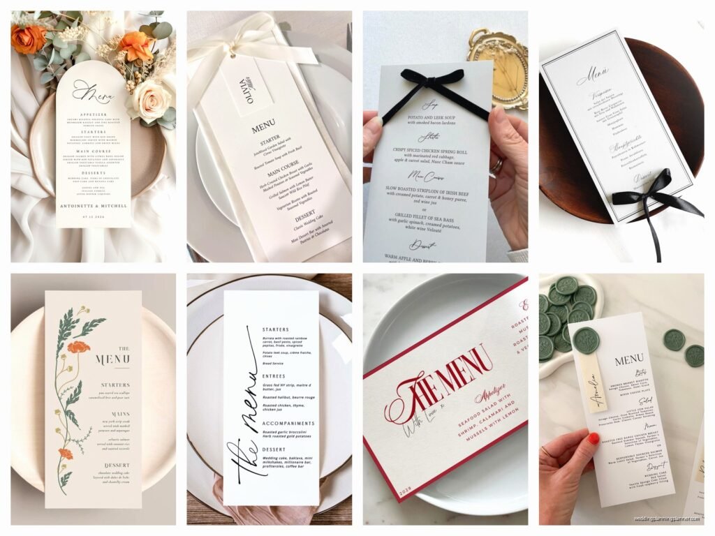 There are like five main styles I see over and over. The classic single card that sits at each place setting—usually 5×7 inches. The menu that doubles as a place card which I actually love because it’s one less thing to design. The table tent style that stands up in the center of the table so one menu serves the whole table (saves money but looks less fancy). Then there’s the menu printed directly on the table number card, and finally the menu tucked into the napkin fold which looks elegant but half the guests don’t notice it.